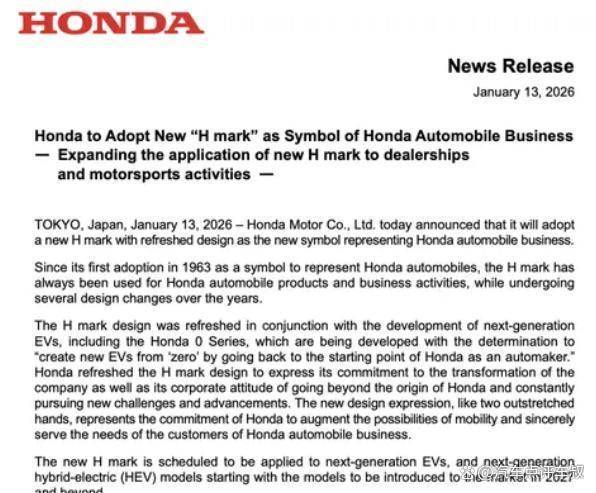 近日,本田汽车正式官宣,自2027年起,其全品类车型以及经销商门店、全渠道品牌宣传物料,将全面启用全新设计的“H”标。这是本田自2001年以来,时隔26年对品牌标识的首次重大迭代,也是其品牌诞生60余年以来,首次实现全场景标识的全面更新。